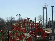 Scream at Six Flags Fiesta Texas in San Antonio, Texas opened on March 13, 1999, in the Rockville section of the park. While it first opened with two towers, a third tower opened on May 28, 1999.[1]The third tower was built along with the ride originally, however its only function was to act as a support beam. The ride was shut down roughly a month and a half later to construct the third tower due to the lines for only two towers averaging wait times of roughly 3 to 5 hours. It was the very first "combo tower" from S&S Power, combining the ride actions of both a Turbo Drop and Space Shot in one ride cycle. These towers also have the capability of running both actions separately via a control switch on the operator booth.[2] The ride was fabricated by Intermountain Lift, Inc.[3]