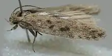 The wingspan is 12–14 mm (0.47–0.55 in).[4] Terminal joint of palpi as long as second. Forewings pale greyish-ochreous, sprinkled with dark fuscous and ochreous-whitish; stigmata dark fuscous, first discal rather beyond plical; a dark fuscous spot close beyond and slightly beneath second discal, sometimes confluent with it; an indistinct fine pale angulated fascia at 3/4, sometimes obsolete. Hindwings 1, whitish-grey, terminally darker. The larva is pale yellowish-green; dorsal line reddish; sides sometimes rosy-tinged; dots blackish-grey; head pale brownish-ochreous; plate of 2 blackish-brown.[5]