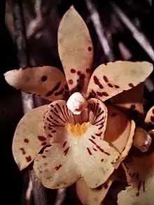 The flowers are large, wide open, and last during about two weeks.[2] They have sepals of similar sizes and form an almost invisible chin with the column foot. The petals may be similar to the sepals but smaller, or much smaller and with a much narrower base, occasionally showing different patterns or colors. The labellum articulates with the column, is trilobed, with comparatively small lateral lobes and larger terminal, which has variable shapes with diverse patterns and a callus under to column. The later is é semi-cylindrical, slightly arching, erect and thick, without any kind of appendix, ending in an apical anther and elongated in a small foot at the base. The flowers bear to pairs of pollinia of different sizes. The caudicle is narrow and the retinacle is small. The fruits resemble the ones of Maxillaria.[8] There are no observation records of pollinators activities but Scuticaria are supposedly pollinated by Euglossini bees.[7]