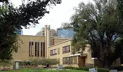 MacRobertson Girls' High school was constructed in 1933–34 to Norman Seabrook's competition-winning design. It remains one of the first and best examples of Modernist architecture in Melbourne and was said by Robin Boyd to have signalled ‘the 1934 revolution’ of Victorian architecture.[1]: 28 Influenced by Dutch Architect Willem Marinus Dudok’s Hilversum City Hall, the school was arranged in a functionalist manner, breaking the program down into series of intersecting cream-brick volumes according to De Stijl principles, interrupted by large strips of red-framed windows and blue-glazed window sills.[2] The building was a radical departure from school buildings of the time, even including a rooftop classroom, and was the first Willem Marinus Dudok inspired building designed by Seabrook, the principles of which would be repeated and adapted through much of the practices later work.