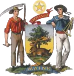 The Great Seal of the State of Maine was adopted in June 1820. The concept of the design is attributed to Benjamin Vaughan of Hallowell, Maine,[1] while the original sketch is credited to Bertha Smouse, the step-daughter of Col. Isaac Reed of Waldoboro, Maine, who purportedly wrote its official description and explanation.[2] There have been variations in the details of the seal, but the overall design and images remain true to the original. The center of the seal is a shield adorned with a tranquil scene of a moose resting in a field bordered by water and woods; a pine tree stands tall directly behind the moose. On either side of the shield, a farmer rests on his scythe, and a sailor leans on an anchor. Above the shield is the motto "Dirigo" (I direct) and a stylized North Star. Below the shield is a banner that reads "Maine". The legislature of 1919 decided that the design of the seal should no longer vary, and the design is still used today.