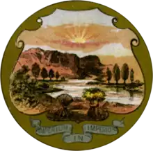 Before Ohio's statehood, the territorial government of the Northwest Territory had its own seal. The United States Congress passed legislation on May 8, 1792, that directed the U.S. Secretary of State to "provide proper seals for the several and respective public offices in the [Northwest] Territories". A seal was created by the State Department to be used on official papers of the territory. The original seal was maintained by Governor Arthur St. Clair. Its first recorded use was in a proclamation made on July 26, 1788.[6] The seal bears a Latin inscription, Meliorem lapsa locavit, "He has planted one better than the one fallen," commemorating the decline of wilderness to make way for civilization.[7]