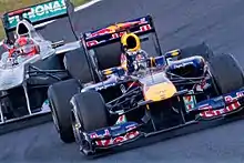 Vettel started the 2011 season with wins in Australia and Malaysia, before a second-place finish at the Chinese Grand Prix due to poor tyre management, possibly related to his inability to properly communicate with his team, as his radio was broken.[78] In Monaco, Vettel led the race but due to another radio malfunction, the Red Bull pit crew was not prepared when he came in. The pit stop was slow and he was sent out on the wrong tyres, handing the lead to Button. Vettel switched to a one-stop strategy and stuck with one set of soft tyres for 56 laps. He was caught by Alonso and Button as his tyres deteriorated, but neither were able to pass him.[79] The race was red-flagged with few laps remaining, which allowed teams to change their tyres; when the race was restarted under the safety car, Vettel was able to retain the lead and win.[80]