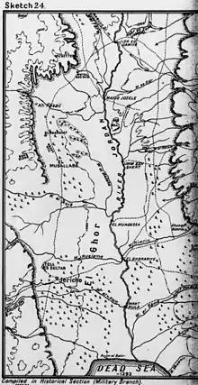 During the first Transjordan attack reinforcements from Nablus in the Judean Hills crossed the Jordan River to attack the northern flank, threatening the supply lines of Shea's force.[33][34] This area, together with the infantry frontal attack on Shunet Nimrin, saw the first stage of the second operation; capturing Jisr ed Damieh, Es Salt and Madaba would allow a base for advances to the Hejaz railway at Amman and the railway junction at Daraa.[31][32]