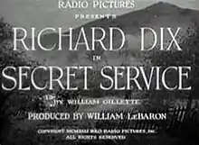 Secret Service is a 1931 American Pre-Code drama film directed by J. Walter Ruben and written by Bernard Schubert. The film based on a play by William Gillette, stars Richard Dix, William Post Jr., Shirley Grey, and Nance O'Neil.[1][2] The film was released on November 14, 1931, by RKO Pictures.