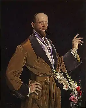 Self-portrait with gladioli is a 1922 oil-on-canvas painting by Australian artist George Washington Lambert. The painting, a self-portrait, depicts Lambert in a brown velvet gown, wearing a purple scarf with a vase holding a gladiolus in front of him.[1]