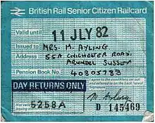 During the early 1970s, some of British Rail's Regions offered a series of small, localised travel promotions for people of or near retirement age. The London Midland and Southern regions were particularly active in this, although other examples existed elsewhere.[1] These promotions were characterised by restricted validity and geographical availability. For example, one Southern Region scheme introduced in 1970 offered pensioners half-price travel at off-peak times on Tuesdays, Wednesdays and Thursdays only, for journeys from a set list of around twenty stations, upon production of their pension book (to confirm their eligibility).[2]