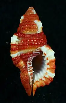 The shell size of Septa rubecula varies between 25 mm and 55 mm.[2] These moderately small shells are commonly rather solid, ovate and vetricose. The six convex whorls are sculptured with one varix on each whorl and with spiral cords, nodules and knobs. Siphonal canal is moderately long. The external shell surface is quite variable in color. It may be bright or dark red, orange or brown with a small white or yellowish transversal band on whorls and with small white patches on varices. The outer lip is ornamented with 8–10 white prominent denticles. The columella is reddish. The inner surface of the aperture is white. The periostracum is yellowish-brown.[5]