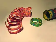 A serpentine streamer is a type of party accessory made out of long strips of paper, wound up in a roll, which form snakelike patterns in the air when thrown. Serpentine streamers can also be used as party decorations, usually hung up from the ceiling across the room, as they form visually appealing serpentines.