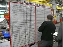 One of the founding principles of Setsuban Kanri is that the work progress control can take place only by combining to electronic tools some visual tools the use of which is the closest possible to the physical place where things happen (e.g. Assembly Dept., R&D office). Four types of tools are used: