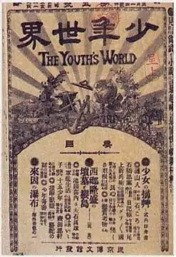 Japanese publisher Hakubunkan was aiming to create a large variety of magazines that would appeal to many different parts of society: Taiyō, Bungei Club, and Shōnen Sekai were the magazines created and all debuted in 1895 (the Meiji era).[1][2][3] On the cover of the first issue of Shōnen Sekai it pictured both Crown Prince Munehito, and the other Empress Jingū who was conquering Sankan (three ancient kingdoms of Korea). Inside of the issue were stories about these matters and Toyotomi Hideyoshi's raid on Korea in 1590.[4] The pioneer of modern Japanese children's media Sazanami Iwaya wrote the first modern children's story Koganemaru in 1891 and also started Shōnen Sekai in 1895.[5] Shunrō Oshikawa invented the "adventure manga" genre, with his works being published many times in both Shōnen Sekai and Shōnen Club and compiled into tankōbon format.[5] In the middle of the Sino-Japanese War Shōnen Sekai featured many stories based on war, or acts of bravery upon war.[4] After the Sino-Japanese War, Shōjo Sekai was created as a sister magazine geared towards the female audience.[6] Even before Shōnen Sekai debuted, Hakubunkan created special magazine issue that would focus on the Sino-Japanese War.[4]