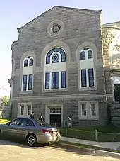 The synagogue was designed by architect Stanislaus Russell[1] and built on a budget on $250,000.[4] The cornerstone of the Shaarei Tfiloh Synagogue was laid on July 10, 1921.[4] Constructed from 1921 and 1927 for $285,000, it is one of the oldest functioning synagogue buildings in Maryland. It holds 700 men and 300 women.[5] The synagogue has a turquoise dome, stained glass windows, and a sanctuary with a balcony for women's seating.[1]