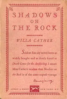 Shadows on the Rock is a novel by the American writer Willa Cather, published in 1931.[1] The novel covers one year of the lives of Cecile Auclair and her father Euclide, French colonists in Quebec. Like many of Cather's books, the story is driven by detailed portraits of the characters, rather than a narrative plot.[2]