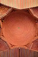 The mosque features extensive brickwork laid in geometric patterns, which is a decorative element unusual for Mughal era mosques,[3] and is an element of Timurid architecture adopted for use in the mosque.[3] The mosque's brickwork was also influenced by Sindhi vernacular styles, which in turn was influenced by Persian architecture.[3] Brick work is most notable in the arcades surrounding the central courtyard, while concentric rings of brick are used to embellish the underside of peripheral domes.