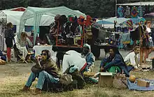In the Deadhead community,[4] and other like-minded musical scenes,[2] an interesting tailgating culture evolved.[1] More than just a party for fans, it is a way for the faithful to sell wares which in turn fund their tickets and gas to the next concert in order to spend weeks, months, or even entire tours on the road.[7] Along with the more traditional fare and beverages such as individual cans or bottles of beer, there may be a selection of vegetarian food[6] such as grilled cheese sandwiches, egg rolls, burritos, falafel,[6] quesadillas, and pizza. Certain illicit foods such as hash brownies and "ganja gooballs" are also sometimes found in the parking lots. Other products available for the tailgaters include handmade jewelry, bumper stickers, t-shirts,[6] entheogenic agents (“head changes”), or drug paraphernalia.
