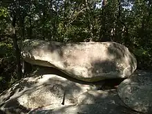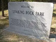 Shaking Rock derived its name from a 27-ton boulder that was so perfectly balanced atop a granite outcrop that it could be moved by the pressure of a hand.[1] Over time, the elements have disturbed this balance to a degree that the boulder can no longer be moved. Reportedly, the "shaking rock" was knocked to the earth by the 1886 Charleston earthquake. Other huge natural granite outcroppings in unusual shapes are scattered throughout while a picnic area active beaver pond, and several nature trails with identified trees enhance the park.