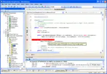 SharpDevelop was designed as a free and lightweight alternative to Microsoft Visual Studio, and contains an equivalent feature for almost every essential Visual Studio Express feature and features very similar to those found in Borland Kylix and Delphi, including advanced project management, code editing, application compiling and debugging functionality.[12][13] More specifically, the IDE includes a GUI designer, code/design views, syntax highlighting, auto completion menus (similar to IntelliSense[14]) the ability to compile and debug form/console .NET Framework applications,[6] a "New Project" wizard, toolbars, menus, panels and a docking system,[15]:7[16][17][18] and built-in code refactoring tools,[19][20] and it has an integrated debugger[21] that allows for stepping, viewing values of objects in memory, and breakpoints.[22]
