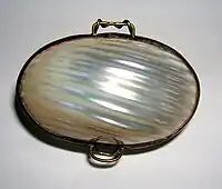 A shell purse is a type of coin purse that is made from whole or trimmed mollusk shells, especially from bivalve mollusc shells. These purses are of mainly novelty use and purchased as souvenirs of visits, etc. In the past, some were engraved or painted with floral or other decorations, sentimental messages, personal or place names. In many cases there was extra working of the shell, either grinding down and polishing to expose the mother of pearl or filing to form patterns such as criss-cross designs.