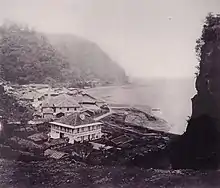 The Shūseikan (集成館) industrial area established by Shimazu Nariakira in 1852 in Iso (磯), Satsuma Province. A "foreigner's building" (異人館) was built to house seven English technicians, (head of these being one E. Home). 1872 photograph.