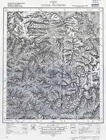 The col discovered by Longstaff in 1905 seemed less suitable than one further south, spotted by Hugh Ruttledge in 1932.[54][55] However they were distracted by Trisul East (now called Maiktoli, 22,320 feet (6,800 m)) which looked technically straightforward so, while Tilman continued surveying with Pasang, the other three made the first ascent of the peak in conditions, according to Shipton, "almost up to Everest standards".[56] The three men had to share a two-man tent so, at night, when one turned they all had to. The Sherpas found this tremendously funny – Shipton less so.[57] On their return, Shipton and Tilman explored a subsidiary ridge to the south ridge of Nanda Devi itself merely thinking it might provide a good view of the southern Sanctuary. At 20,500 feet (6,200 m) they had to turn back but they had decided that this ridge gave a good chance of reaching the summit for a suitably prepared expedition.[58] On 17 September the entire party started the climb to Ruttledge's col to look down the 6,000 feet (1,800 m) precipice and icefall to the Sunderdhunga Glacier. It took two days to discover a route down the precipice and Ang Tharkay was the person who found the way that was at last successful. Descending the valley they reached the Pindar River. At last reaching Sameswar they were able to board a bus to Ranikhet and they went their separate ways at Bareilly with Shipton writing his book Nanda Devi on his six-week voyage home.[56][8]