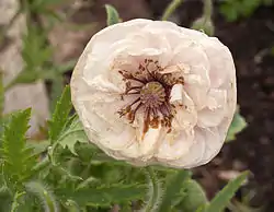 The Shirley poppy was created from 1880 onwards by the Reverend William Wilks, vicar of the parish of Shirley in England. Wilks found in a corner of his garden where it adjoined arable fields, a variant of the field poppy that had a narrow white border around the petals. By careful selection and hybridization over many years he obtained a strain of poppies ranging in colour from white and pale lilac to pink and red, and unlike the wild poppies these had no dark blotches at the base of the petals. Further selection has given rise to semi-double and double forms, as well as flowers with a ring of contrasting colour around the edge: the picotee form.[1][2]