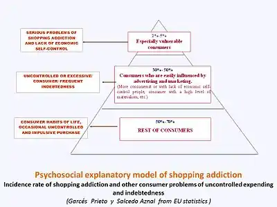 Psychosocial approach : Since the 1980s a significant increase in the number of people with important problems of lack of control in shopping and spending has been established. Given the fact that this increase was parallel with the spreading of the values and behaviour of the consumer society, these disorders started to be considered as an individual manifestation of a general social problem. A model taking this approach was one by Javier Garcés and Alejandro Saucedo,[27] who regard shopping addiction as "the tip of the iceberg” that is, the most intense manifestation of a general problem which affects, to a greater or lesser extent, a great deal of the population.[28] The behaviour differences between the average consumer and the shopping addict are more quantitative than qualitative. Advertising and commercial influences, which cause in some people serious problems of shopping addiction or excessive indebtedness, also contribute to excessive consumer behaviour in many others. This model is graphically described by the “consumerist pyramid”. Another model is the one defended by Helga Ditmar, which could be classified as a mixed model, since she considers that shopping addiction problems are caused by the conjunction of two factors: a high level of materialism and a high discrepancy between the real self-concept (how the person sees themselves) and the ideal self-concept (how the person wishes to see themselves).[29]