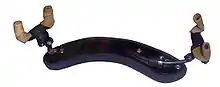 The shoulder rest is an accessory that can be found on violins and violas. The shoulder rest appeared around the middle part of the 20th century.[1] It may be made of wood, aluminium, carbon fiber or plastic. Usually, the shoulder rest attaches to the edge of the back of the violin with "feet" padded with rubber tubing or made of soft plastic. The goal of a shoulder rest is to allow a more comfortable attitude while playing by adding height to the shoulder and preventing the instrument from slipping.[2] A shoulder rest generally follows the curve of the shoulder; some shoulder rests are bendable, others are made of sponge-like material, and a few have an extension that hooks further over the shoulder for stability.