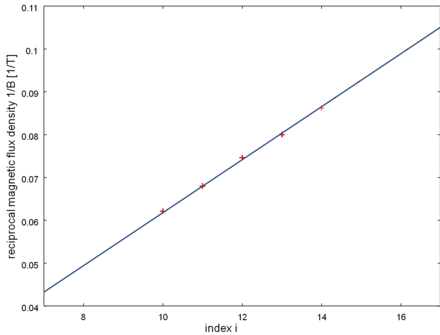 For a given sample, all factors including the electron density n on the right hand side of relationship (3) are constant. When plotting the index i of an edge channel versus the reciprocal of its magnetic flux density 1/Bi, one obtains a straight line with slope 2 ∙ e/(n∙ h). Since the electron charge e is known and also Planck's constant h, one can derive the electron density n of a sample from this plot.[3] Shubnikov–De Haas oscillations are observed in highly doped Bi2Se3.[4] Fig 3 shows the reciprocal magnetic flux density 1/Bi of the 10th to 14th minima of a Bi2Se3 sample. The slope of 0.00618/T as obtained from a linear fit yields the electron density n