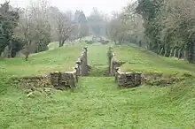 Pits, sherds, and flint are evidence of Neolithic inhabitation of the Siddington area. Beaker pottery found in the area suggests Early Bronze Age activity, and various earthworks are evidence of middle Bronze Age and Iron Age use of the area.[2] Ermin Way, the Roman road connecting Glevum (Gloucester) to Calleva Atrebatum (Silchester) via Corinium (Cirencester) forms part of the parish's north-eastern border.[3] Romano-British settlements existed near the west border and at the south of the parish. The latter settlement is evidenced by pottery and building debris, as well as discoveries of a well and a coin of Constantius II.[3] Excavation of a third Romano-British settlement, near Ermin Way, uncovered a sherd from a situla dating from the Iron Age.[3]