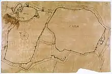 The English army landed on the coast of Normandy near Deauville. Henry's plan was to capture and garrison the major cities and towns of Lower Normandy, before moving on towards Paris. His first objective was the city of Caen, the second largest in Normandy with a population of up to 40,000.[2] The recently improved defensive walls had a total of twelve gatehouses and thirty two towers. The upper or old town with its castle, the Chateau de Caen, stood on a hill, overlooking the lower or new town, which was almost completely surrounded by a loop in the River Orne.[3] The French garrison began demolishing buildings outside of the walls to avoid giving cover to the attackers, however two large monasteries were still being prepared for demolition when the English vanguard, led by Thomas of Lancaster, Duke of Clarence, arrived. Clarence took over the Abbey of Sainte-Trinité as his headquarters. A story says that a monk from the other monastery, the Abbey of Saint-Étienne or Abbaye aux Hommes ("Men's Abbey"), came to Clarence at night, begged him not to allow the French troops to destroy the church and offered to show him a way over the abbey walls.[4] The abbey, which had a commanding view over the town, was captured and Henry later installed guns on the roof.[3]