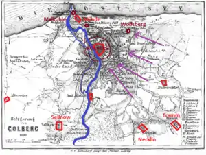 Plan of the siege. Purple: French trenches; dark areas around Kolberg: flooded and rubble of burned suburbs.