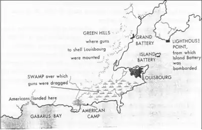 Upon landing, the British forces immediately launched an attack on the North East Harbour (present-day Louisbourg, Nova Scotia). The act terrorized the French and they abandoned the Royal Battery with much of its armaments still operational.[19] The British immediately occupied the battery and began firing at the fortress. They repulsed a French and Indian attempt to re-take the battery the following day.