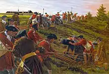 On June 27, French and native reinforcements led by Paul Marin were prevented from reaching Louisbourg in the Naval battle off Tatamagouche.[25] The New Englanders' landward siege was supported by Commodore Warren's fleet and, following 47 days (six weeks and five days) of siege and bombardment, the French capitulated on June 28, 1745.