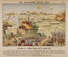 The division was to cross the river at Andenne but "Belgian civilians" delayed the passage in street fighting.[lower-alpha 1] The 3rd Guard Division was delayed at Hingeon and by a Belgian counter-attack from Cognelée. On the south bank XI Corps repulsed Belgian attacks and reached its assembly areas and established a flank guard at Florée. The German artillery arrived late and so the bombardment was postponed until 21 August. The terrain on the south-east front was found to be unsuitable for an attack and the 38th Division was ordered forward to Haltinne and the 22nd Division took over the front of attack, on the south bank of the Meuse.[14]