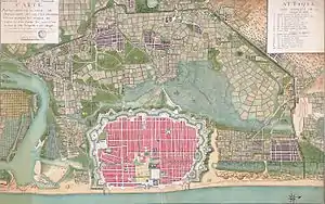 The French military position in India was considerably weaker than the British, with no significant investment in the colonies since the outbreak of the Seven Years' War in 1754.[3] The French held a number of small trading ports, including Karaikal, Yanam, Mahé and Chandernagore but the most important colony was at Pondicherry, close to Madras.[4] Pondicherry was formidably fortified, the extensive and modern defences designed by Camille Charles Leclerc, Chevalier de Fresne, but the garrison was far too small to effectively man the walls in the face of a determined siege.[4] The French Navy presence in the Indian Ocean at the outbreak of war comprised the two frigates Cybèle and Prudente under Contre-amiral Saint-Félix but were not based in India at all, but on the distant Île de France (modern Mauritius).[5]
