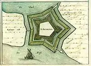 The siege of San Andreas also known as the siege of Sint-Andries was a military event that took place during the Eighty Years' War and the Anglo–Spanish War from 28 January to 6 March 1600. The Spanish garrison of San Andreas was besieged by an Anglo-Dutch force led by Maurice of Nassau.[5] A Spanish relief force under the command of Luis de Velasco failed to relieve the fort after having been turned back by the besiegers. The fort surrendered after the garrison mutinied and accepted payment from Maurice.[6]