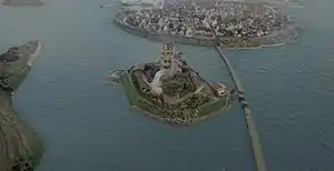Peter's plan for the second siege of Viborg involved a combination of land and sea forces, and the fort was to be taken by a prolonged siege. By February 1710, a specialized siege corps had been assembled on Kotlin Island.[12] This time, the Russian attack came in two stages. On 2 March 1710, General Apraksin received orders to attack Viborg, and he planned to move out by 15 March.[13] However, on 16 March, he was still on Kotlin Island, from where he wrote to Robert Bruce that he was departing on "the day of tomorrow".[14] In fact, he only set out on 21 March, arriving with the cavalry on that same day at Viborg; the infantry and cannon arrived the next day.[15]