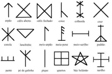 Lixa Filgueiras argued that there are two types of symbols, distinguished by their use: the marcas (marks) and siglas. The marks served as a way to register ownership and thus were commonly present. The siglas, on the other hand, were used for magical and religious concerns.[1] The siglas, being symbols of a mythical character, were thus rarer both in their ancient and newer forms.