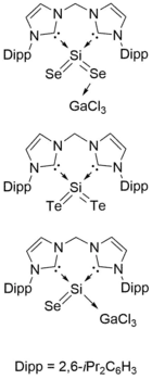 Other chalcogenide structures have also been synthesized. Reaction of (bis-NHC)Si(GaCl3) with selenium can produce the monochalcogenide (bis-NHC)SiSe(GaCl3).[11] Dichalcogenide analogues with Se and Te can also be synthesized, whose structures were confirmed using 29Si{1H}-NMR, infrared spectroscopy (IR), MS, and single-crystal X-ray diffraction.[11] NRT analysis of the SiSe2 and SiTe2 complexes reveals a predominance of the resonance form containing a single Si-X (X = Se, Te) bond with semi-polar character, similar to that of the SiS2 structure[11]