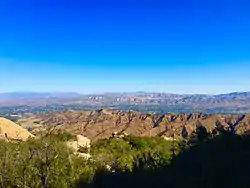 Simi Valley (Chumash: Shimiyi)[1][2][3] is a synclinal valley in Southern California in the United States. It is an enclosed or hidden valley surrounded by mountains and hills. It is connected to the San Fernando Valley to the east by the Santa Susana Pass and the 118 (Ronald Reagan) freeway, and in the west the narrows of the Arroyo Simi and the Reagan Freeway connection to Moorpark. The relatively flat bottom of the valley contains soils formed from shales, sandstones, and conglomerates eroded from the surrounding hills of the Santa Susana Mountains to the north, which separate Simi Valley from the Santa Clara River Valley, and the Simi Hills.[4]