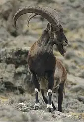 The park is populated with a total of 21 large mammal species live within the park boundaries[5] such as gelada baboon (Theropithecus gelada), Ethiopian wolf (also called Simen fox, Canis simensis), Walia ibex (Capra walie), and Menelik's bushbuck (Tragelaphus scriptus meneliki).[8] Inhabits on the slope of the northern slope of the massif are mostly native to the Simien Mountains, and most of them are found in the park. The Ethiopian wolf, Gelada baboon, Menelik's bushbuck, and Walia Ibex are mammals endemic to Ethiopian Highlands. Other rare mammals include Hamadryas baboon, colobus monkey, leopard, caracal, serval, wild cat, spotted hyena, golden jackal, and Anubis baboon. There are also small herbivores that are within the slopes of simian mountains, such as rock hyrax, common duiker, and klipspringer.[5]