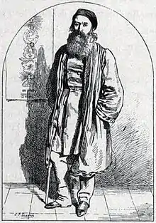 Ganneau, drawn in 1883 (after his death) by contemporary cartoonist Charles-Joseph Traviès de Villers, in front of a poster depicting the five phases of the world he preached would occur.