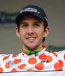 Yates along with his brother joined the Australian UCI World Tour team Orica–GreenEDGE in 2014.[17] He finished 12th overall in one of his first World Tour races, the Tour of the Basque Country. Yates suffered a broken collarbone on Stage 3 of the Tour of Turkey.[18] He recovered to take seventh overall and the young rider classification in the Tour of Slovenia in June. He was a surprise selection for the Orica–GreenEDGE team for the 2014 Tour de France, with only 5 days' notice, and was one of only 4 British riders to take to the Grand Départ startline in Leeds.[19] Yates featured in two breakaways during his Grand Tour debut, before being withdrawn by his team on the second rest day.[20]