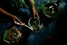 Sinabawang gulay, usually anglicized as Filipino vegetable soup, is a Filipino vegetable soup made with leafy vegetables (usually moringa leaves) and various other vegetables in a broth seasoned with seafood stock or patis (fish sauce).[1][2] The ingredients of the dish can vary widely. It is eaten on its own or over white rice.[3]