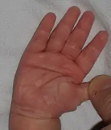 | Single transverse palmar crease on an infant's hand | |