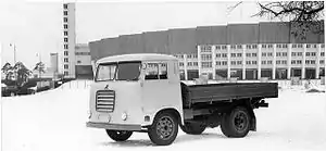 The new model was developed under supervision of Nils Fagerstedt[5] and Senior Engineer Pentti E. Lehtinen. The objective was to design the lorry as light as possible with the biggest possible load capacity. The tyre size selected was 7.50-16", which allowed 1 000 kg load per unit and also a low platform height, and therefore limited the total weight to 6 000 tonnes. The wheelbase was 2 500 mm and the outer dimensions were small, making the lorry agile. A forward-control cabin enabled a 3 450 mm platform length. In order to reduce weight, the frame was joined together completely by welding, instead of riveting, which had been the case in every previous Sisu model. The steel used had almost 50% better tensile strength than the materials used by then. By these actions a weight saving of over 100 kg was reached.[2]