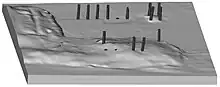The first excavations at the site were carried out by B.B. Lal in 1948. An American-Indian team took up work in 2001. In 2005 ground penetrating radar revealed the probable position of the southern moat.[7] Toward the centre of the fortress (Area D) the 19 column structure has been recorded three-dimensionally by means of a laser scanner. It is disturbed and incomplete. Two gates pierce each of the glacis of the quadrangular plan. As at contemporary Jaugada, the plan tips 10° clockwise of north.[8] With 1,125 m × 1,115 m (3,691 ft × 3,658 ft) (measured on the crest), Sisupalgarh is larger in surface than is Jaugada. Sisupalgarh's defences are the highest known of this period in India. The ancient settlement probably was not dense, but rather there was room inside the fortress to graze.