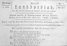 On December 22, 1807, Aarflot wrote a lengthy request to the king in Copenhagen asking permission to start his own print shop.[7] In his request he listed the handwritten works that he held in his private library and wished to print in thirteen points. In addition, he made it clear that he planned to publish a weekly newspaper called The Village Gazette for Norway ("Et Ugeblad Kaldet: Landboebladet for Norge"). In May 1808, the postal service recommended a postage exemption for the newspaper in Norway and Denmark. On July 15, 1808, Aarflot received permission to engage in printing operations. With the help of a friend from Trondheim engaged in book printing, Aarflot started printing in 1809. This was the first print shop to operate outside of a town in Norway (Ålesund was not a town at that time).