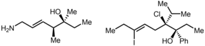 - ↑ In this gallery, double bonds have been shown in red and triple bonds in blue. This was added for clarity – multiple bonds are not normally coloured in skeletal formulae.