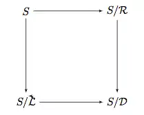 A skew lattice S is symmetric if for any , if . Occurrences of commutation are thus unambiguous for such skew lattices, with subsets of pairwise commuting elements generating commutative subalgebras, i.e., sublattices. (This is not true for skew lattices in general.) Equational bases for this subvariety, first given by Spinks[11] are: and . A lattice section of a skew lattice is a sublattice of meeting each -class of at a single element. is thus an internal copy of the lattice with the composition being an isomorphism. All symmetric skew lattices for which admit a lattice section.[10] Symmetric or not, having a lattice section guarantees that also has internal copies of and given respectively by and , where and are the and congruence classes of in . Thus and are isomorphisms.[8] This leads to a commuting diagram of embedding dualizing the preceding Kimura diagram.